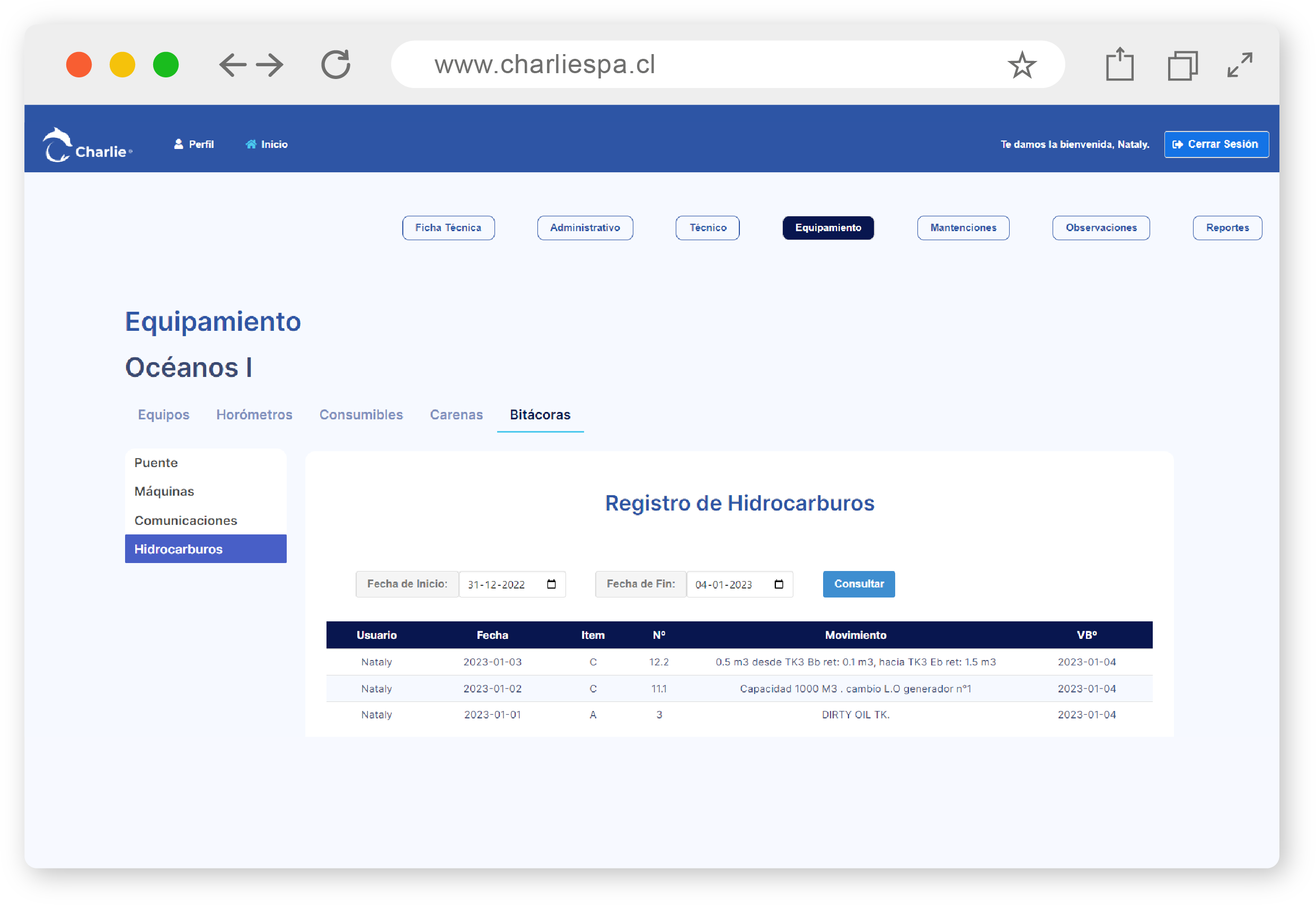 Bitácora de Máquinas: Permite el registro de las temperaturas y presiones de trabajo de los motores y generadores. Se deja registro de los horómetros de los equipos y de los consumibles (combustible, agua y aceite), lo cual se puede visualizar en la plataforma.
