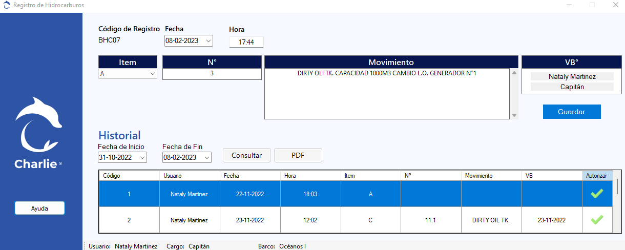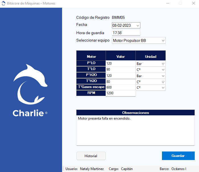 Bitácora de Máquinas: Permite el registro de las temperaturas y presiones de trabajo de los motores y generadores. Se deja registro de los horómetros de los equipos y de los consumibles (combustible, agua y aceite), lo cual se puede visualizar en la plataforma.