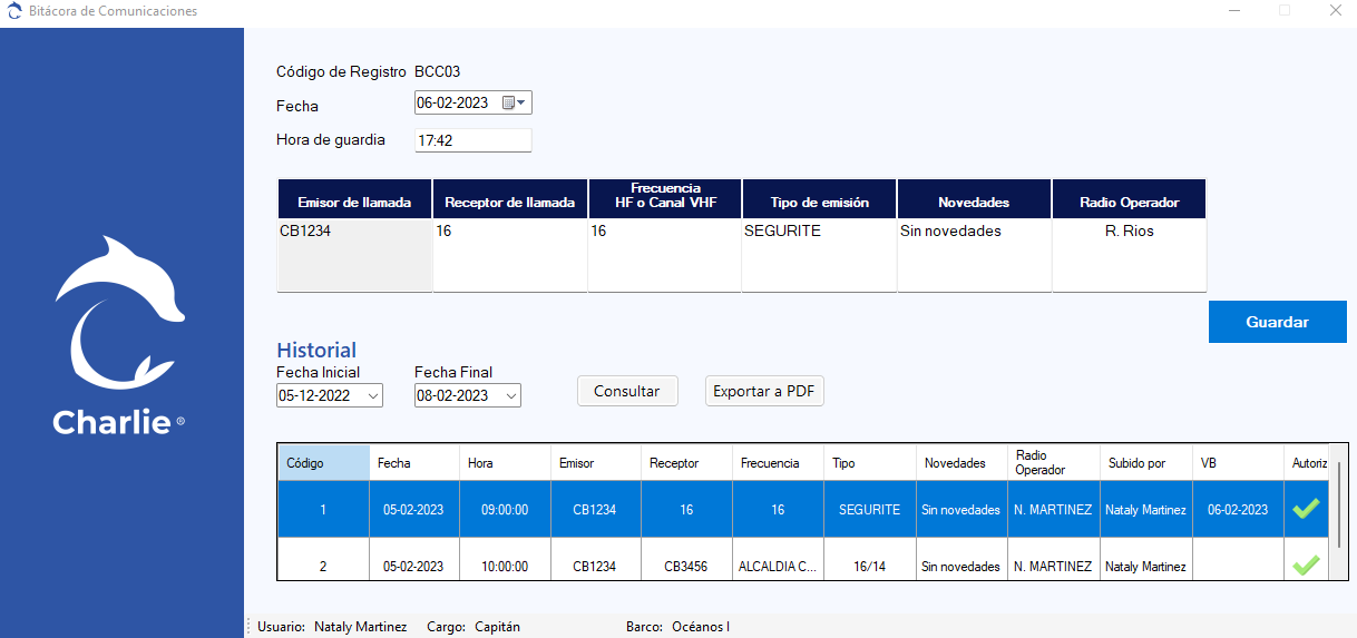 Desde la plataforma se puede visualizar la información enviada desde el software de forma remota, en sus módulos de bitácoras de puente, máquinas, comunicaciones y libro de hidrocarburos. Esta información se puede filtrar por fechas y ser exportada a un documento PDF.